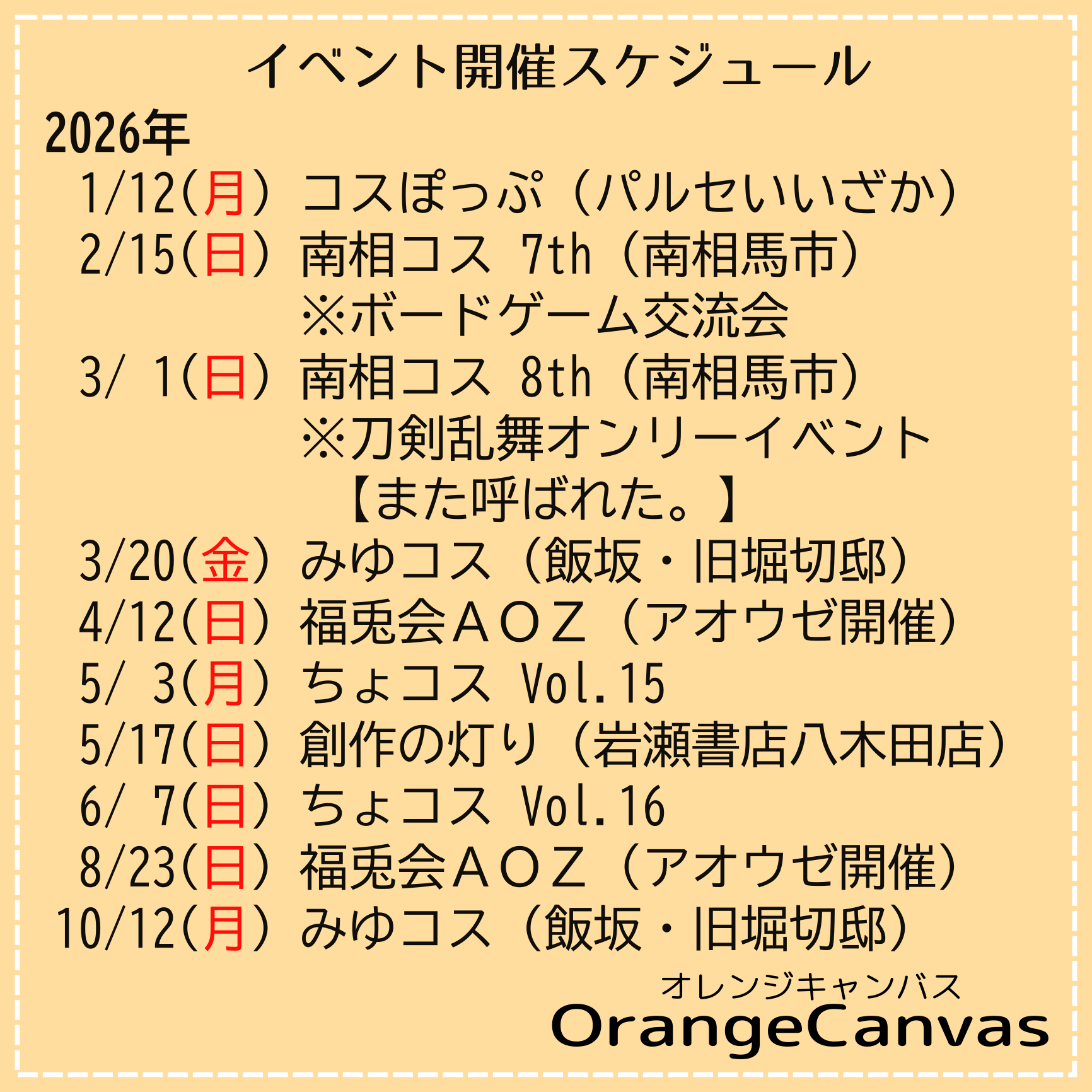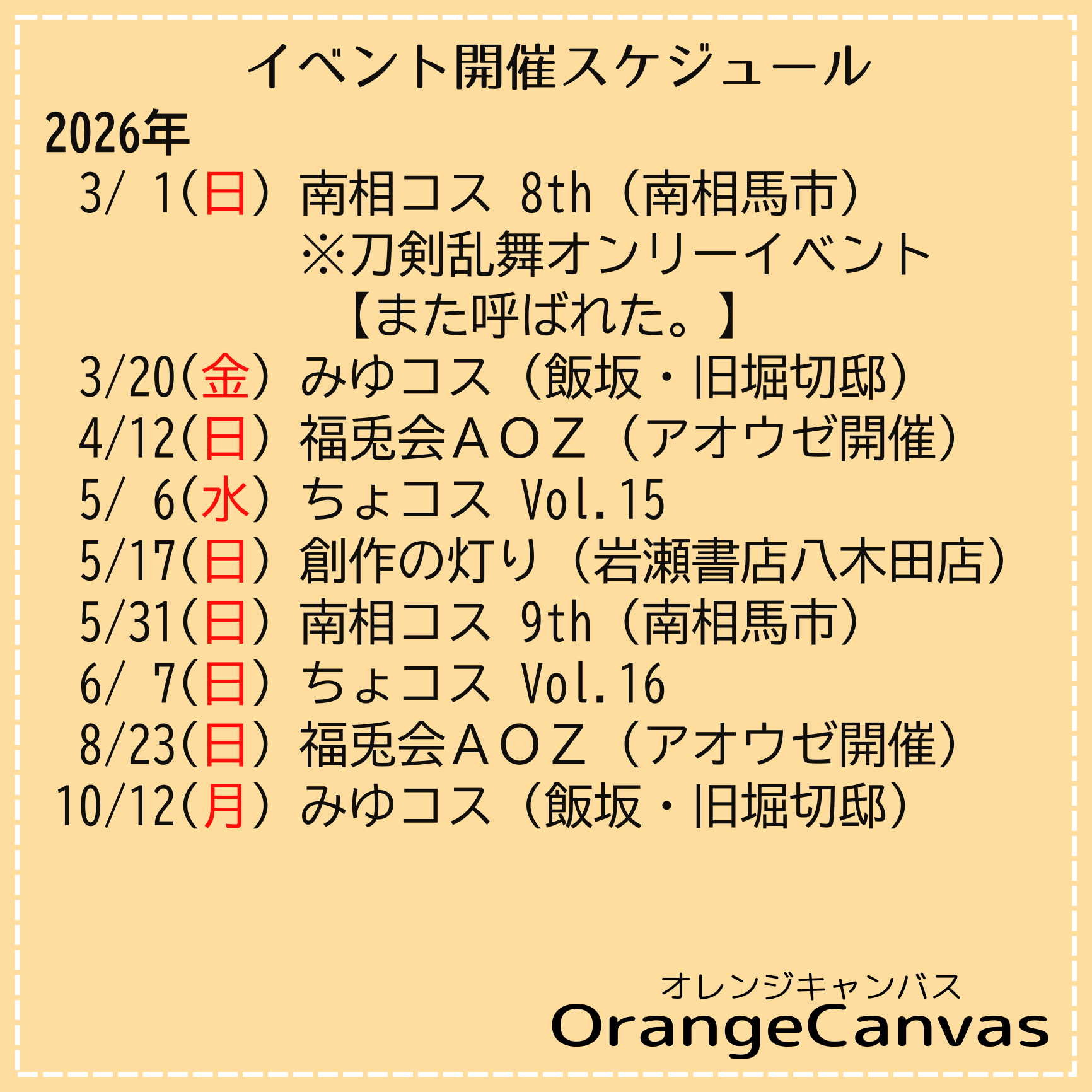 オレンジキャンバスは、福島県福島市を中心に同人誌即売会・コスプレイベントなどアニメ・ゲーム系のイベントを企画・開催しております。 また、イベントの開催を希望されている個人や団体様向けに、企画のご提案・運営の協力・Webサイトの制作を行っております。