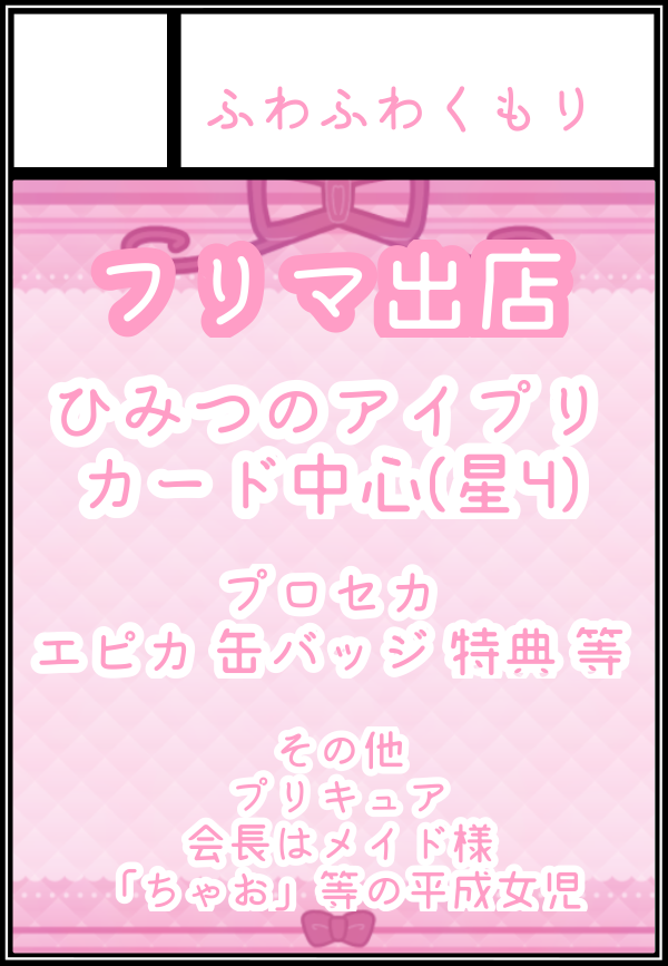 フリマ出店、ひみつのアイプリのカード(星4、ミラクルカード)中心になります、プロセカのエピカ、缶バッジ、特典等も持っていく予定です