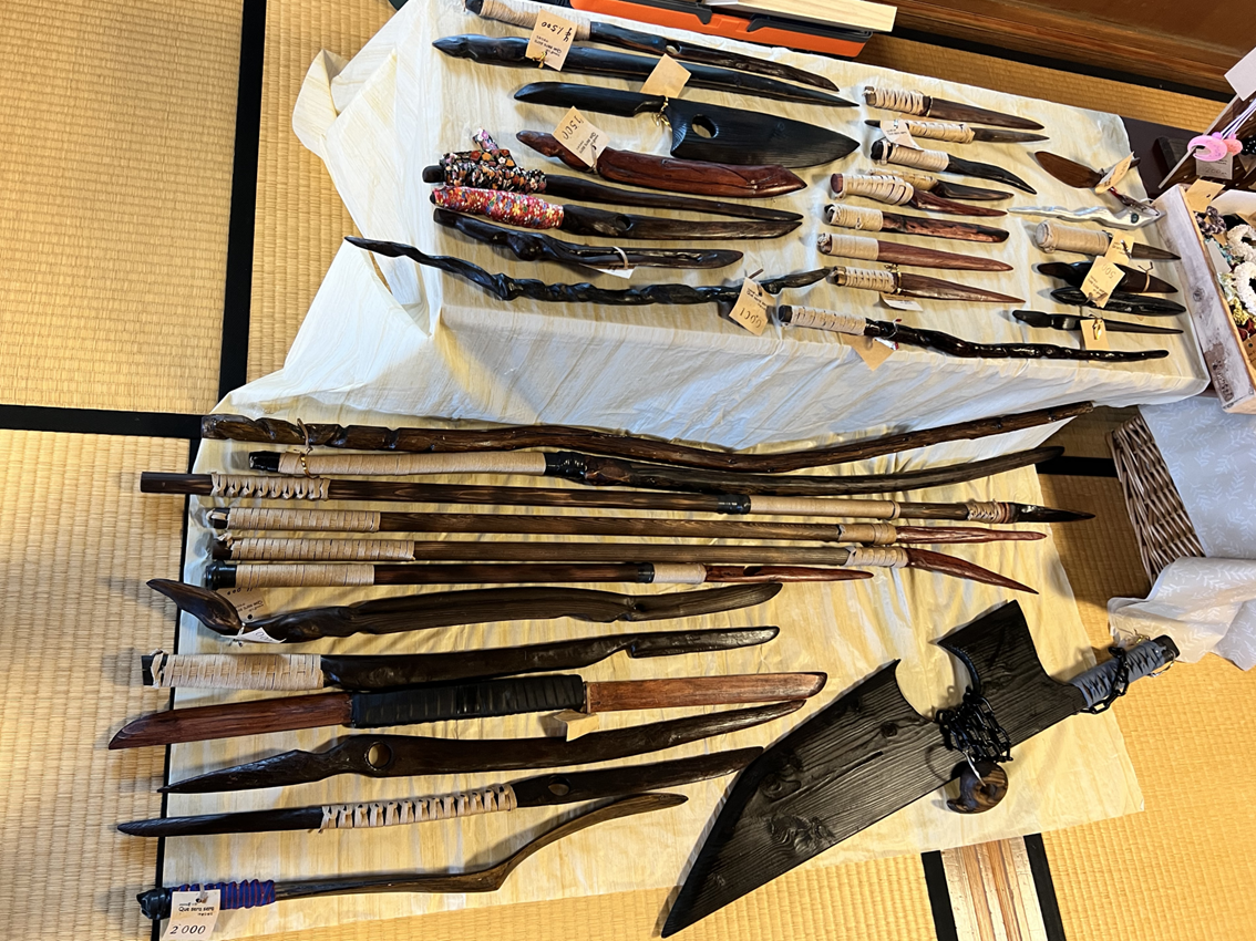 流木や市販の木材を使った創作武器と妻のハンドメイド作品(シュシュやイヤリング、ピアスやクリップなど様々な雑貨)を販売します